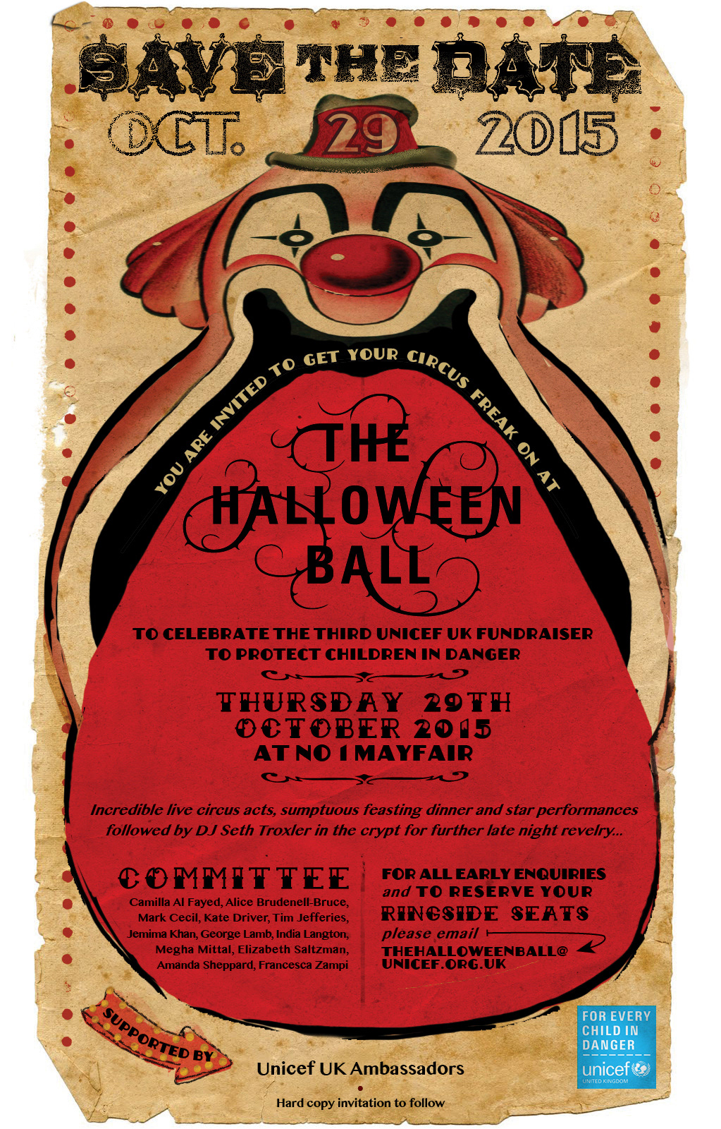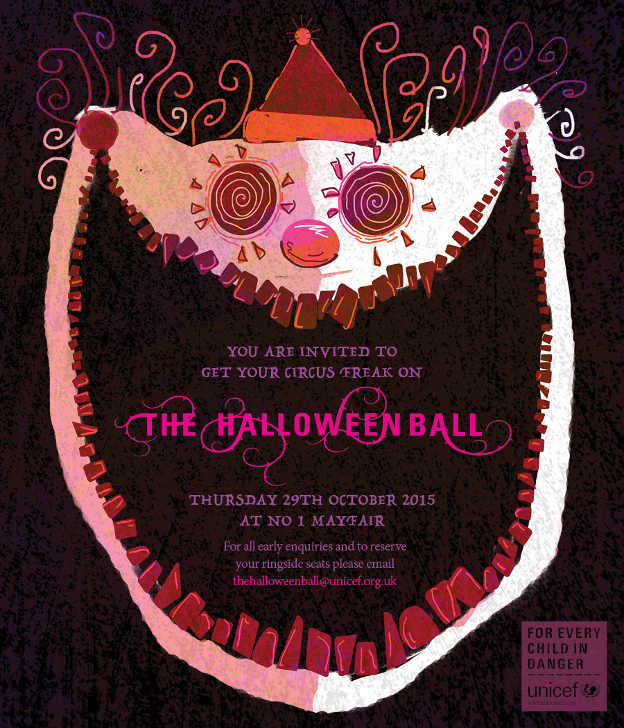 Central graphic concept development, illustration and design for Unicef London's annual Halloween Ball